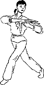 2 .左腿屈膝,右脚铲地上步,左脚盖步,脚尖内扣,右脚再划弧 上步,脚尖外撇。三步走一顺时针向圆弧,目视右方。