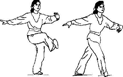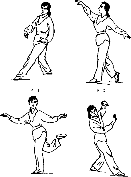 接上式身体起立,重心移于 左腿,燃后右脚提起,左脚为轴心 转体90°( a八同时转两学心向 外,左臂护产胸前。(图7—11右 脚体前蹬脚落步,脚尖外撇45" (n八重心移右腿,同时左掌胸前 推掌,然后重心后移,左手口按至 腹。重心再前移于右脚左手腕背 向外绷出,右手作相应的平衡开合手法。(图7—2)自起立起眼光 看右手再看左手,以后随左手而运目。