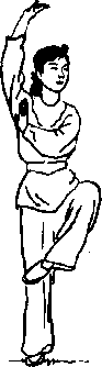 接上式重心后坐于左腿,体左转 右脚尖翘起随体左转135。( I)踏实, 重心移右腿,左脚提起右腿呈他立式. 左腿屈膝左脚掌向里护于右膝左侧。 同时左手向下经左向上划圆运掌按于 右胸前,指尖向上为立掌,右手随转体 向左下方接至大腿侧转掌心向内于左 手下按时向上穿掌,接连转腕成掌心 向上托。(图8)整个动作眼先看左手 再看右手最后独立挺拔。目视前方,