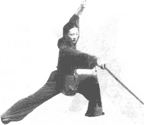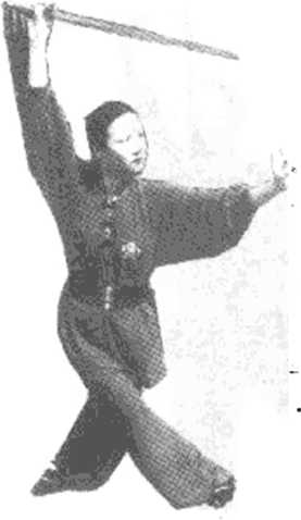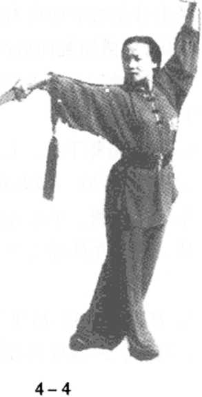 4. 起立点剑,两 腿伸直,重心于右脚, 左手翻指于头左前 方,体向右前45?度 (相),目视剑尖方向' (图 4-4)。