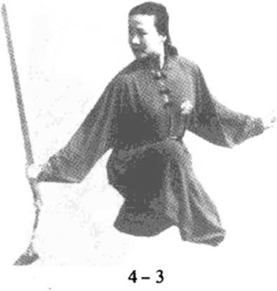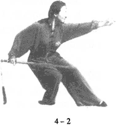 剑指经左,翻于头左上方。重心移右脚,屈膝后坐,右手后抽剑,左 手经体前下落前伸,指尖朝前,掌心朝右(图4 - 2)。重心移左脚, 左弓步直刺,左剑指附右手腕,右脚向左脚前盖步c