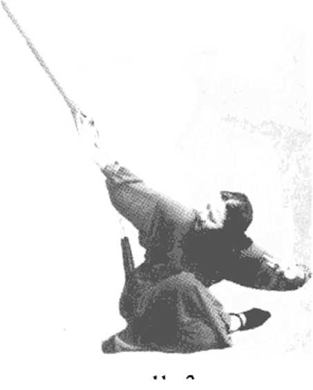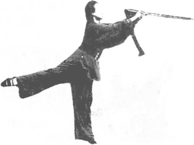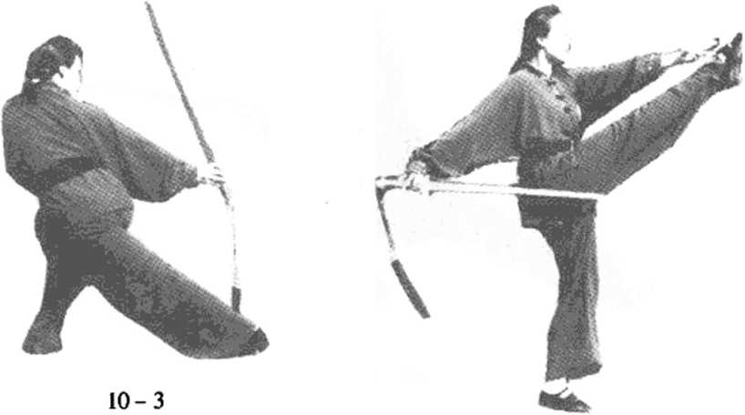 2. 左腿伸直,右腿后抬(图10-2)o体下沉,右脚向前(ID)上 步,左脚倒插,两掌心朝左,顺时针划强撩剑。左翻身180度,目视