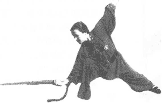 后抽剑,剑贴胯部,左剑 指前指,掌心朝右。右脚 在前,下蹲成坐盘状。