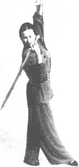 4.右手持剑上绷,左手剑指架于头左上方,同时将左腿屈膝 后抬,脚掌向上,上体略左倾,目视剑尖(图18-4)。
