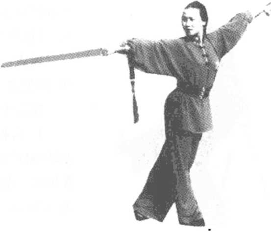 度(V),右腿屈膝,右弓步平劈剑, 左臂后伸,剑指略斜上举,掌心向