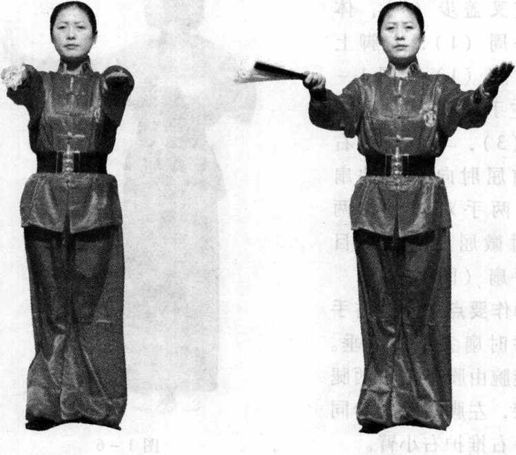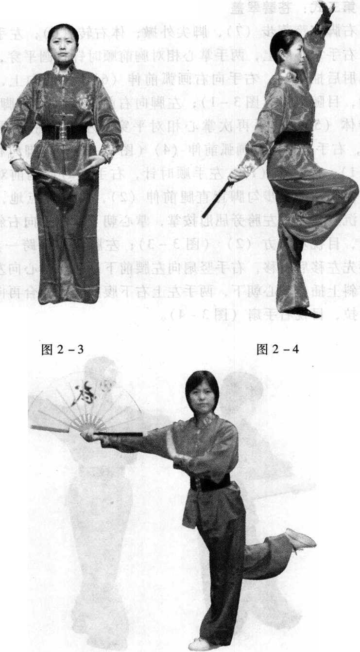 两手体两侧伸展向前画弧前平举,掌心朝下,继尔右手顺时 针、左手逆时针同时向上旋腕,掌心翻朝上,目视正前方(1) (图2-1、图2-2);两肘向体两侧回抽,重心前后微移,两手 收于腹前,指尖相对,掌心向上,两腿微屈,重心下降(图2 - 3);体左转90度(3),左腿直立,右膝前提,脚尖朝下,左手 由左向上顺时针画半立圆额前上方亮掌,掌心翻朝上(3);右 手同时向前斜上逆时针画弧,再朝后斜下截扇,略扣腕(7), 目视前方(3)(图2-4);右脚前落步(3),体右转(1),左脚 向左横步(3),体再右转(8),右手体前顺时针画半立圆侧平 举上开扇(7),左手屈肘立掌护右胸,掌心向右;右脚同时向 左后侧提起(3),目视正前方(1)(图2-5)。