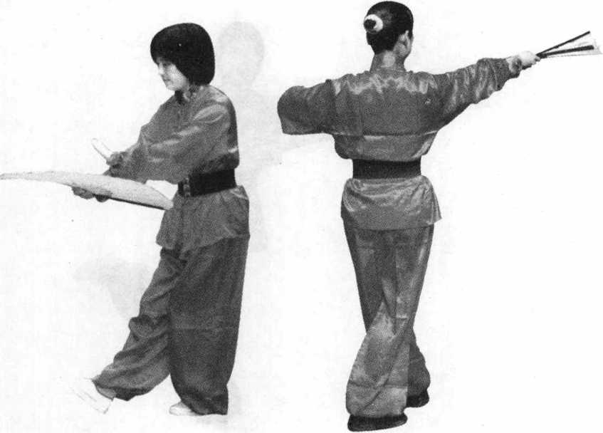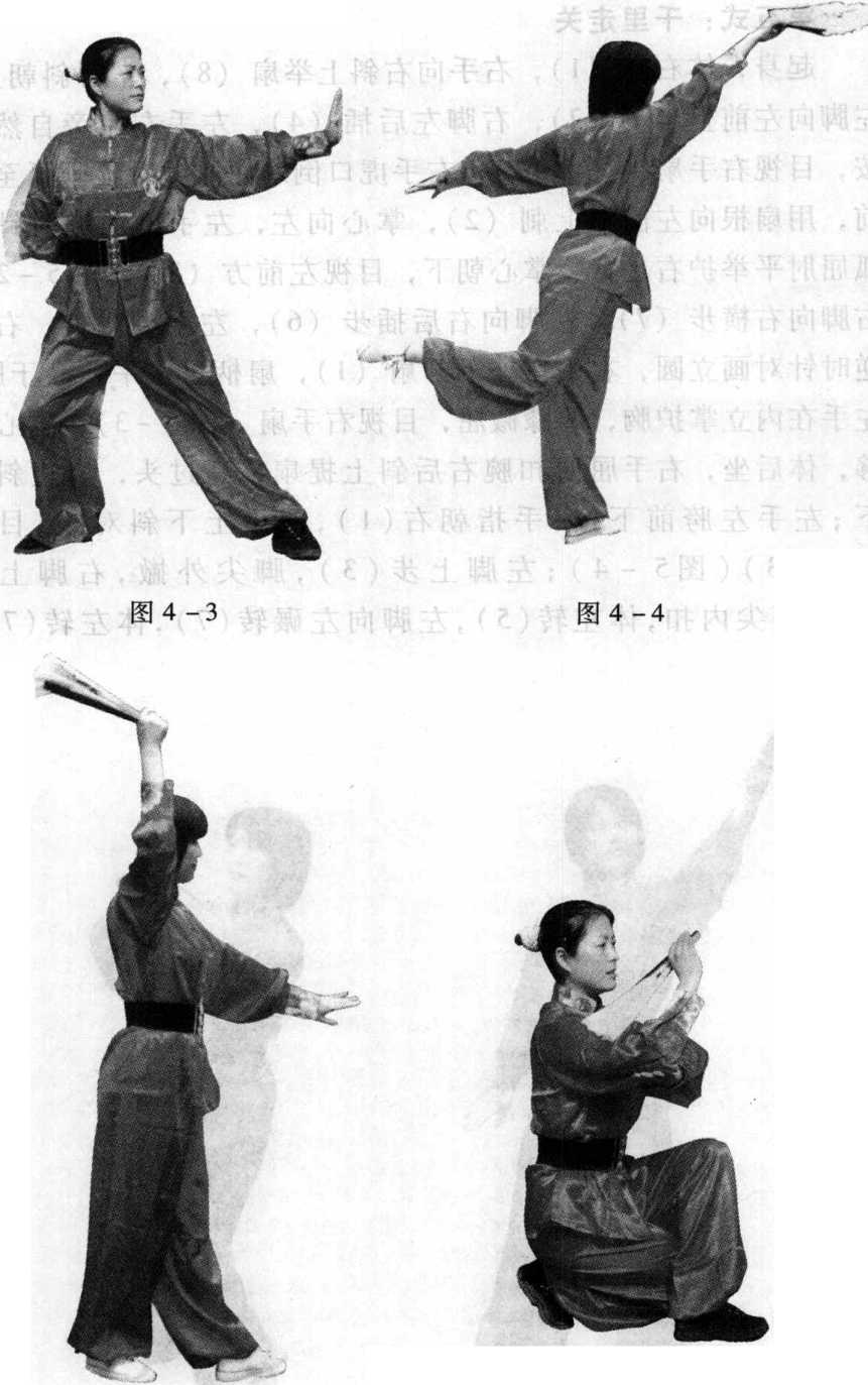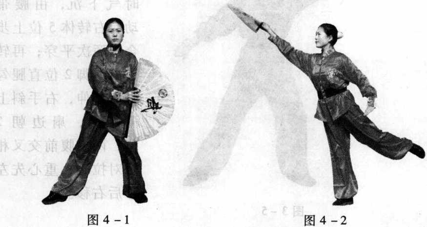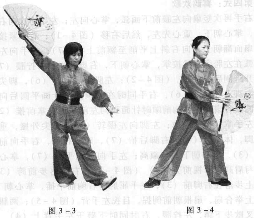 右脚前跨落步(7),脚尖外撇,体右转(6);左手掌心朝 下,右手掌心向上,两手掌心相对胸前顺时针打圆平穿,左手向 左屈肘后抽(2),右手向右画弧前伸(6),掌心向上,两手对 拔劲,目随扇移(图3-1);左脚向右前上步(5),脚尖内扣, 右转体(5),两手再次掌心相对平穿,左手向左后屈肘平抽 (8),右手合扇向右画弧前伸(4)(图3 -2);右脚向右横跨半 步(1),体右转(1),左手顺时针,右手逆时针胸前对称画立 圆,左脚左前上步勾脚背直腿前伸(2),脚跟虚点地,右腿屈 膝;沉胯,左手左胯旁屈肘按掌,掌心朝下;右手向右斜上举上 开扇,目视左前方(2)(图3 -3);左脚向左横跨一步(3), 重心先左移后右移,右手竖扇向左腰前下画弧,掌心向左,左手 向右斜上插,掌心朝下,两手左上右下腹前交叉相合再向两边屈 肘对拉,目视右手扇(图3-4)。