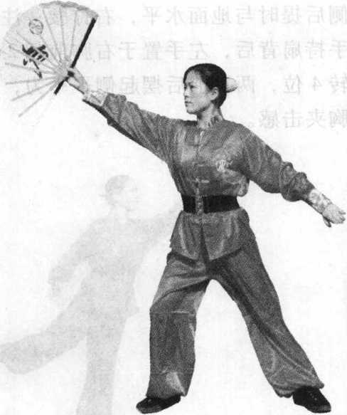 动作要点:左脚开跨侧后提时与地面水平,右拧腰;注意左 右脚上步时均朝6位,右手持扇背后,左手置于右胸前朝2位推 掌。左脚碾转3位时体左转4位,两臂前后摆起侧平举为,右肘 下砸时左拧腰,两臂有含胸夹击感。