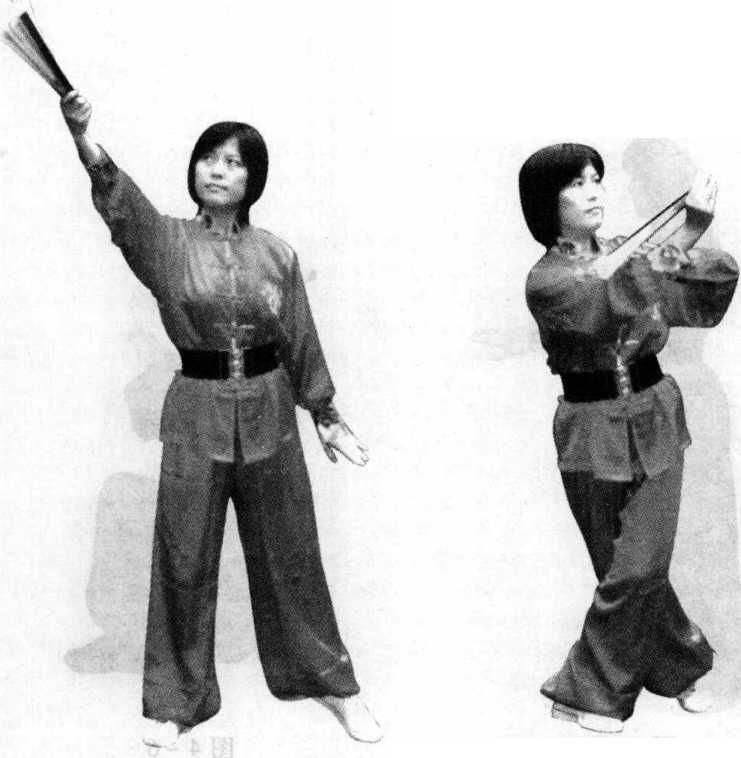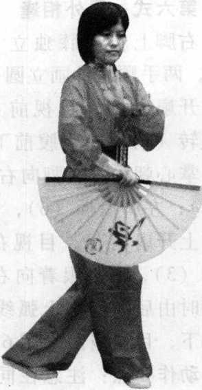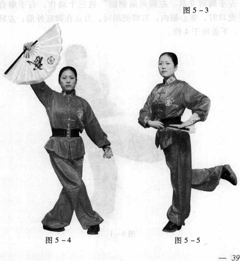 起身,体右转(1),右手向右斜上举扇(8),掌心斜朝上, 左脚向左前上半步(2),右脚左后插(4),左手左胯旁自然下 按,目视右手扇(图5-1);右手虎口倒扇屈肘顺时针画弧至胸 前,用扇根向左前斜上刺(2),掌心向左,左手胸前顺时针画 弧屈肘平举护右小臂,掌心朝下,目视左前方(2).(图5-2); 右脚向右横步(7),左脚向右后插步(6),左手顺时针、右手 逆时针对画立圆,右手在外下开扇(1),扇柄呈水平,高于腰; 左手在内立掌护胸,两膝微屈,目视右手扇(图5-3);重心后 移,体后坐,右手屈肘扣腕右后斜上提扇,高过头,扇边斜朝 下;左手左胯前下按,手指朝右(1 ),两手上下斜对拔,目视 前方(3)(图5 -4);左脚上步(3),脚尖外撇,右脚上步 (3),脚尖内扣,体左转(5),左脚向左碾转(7),体左转(7),