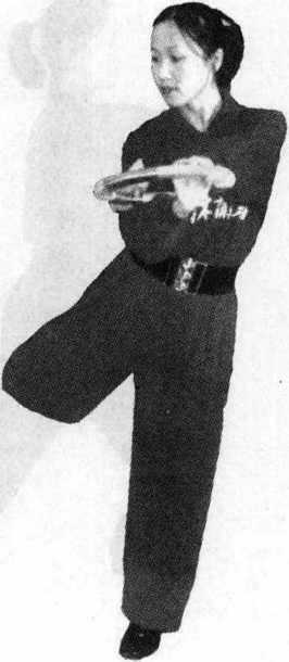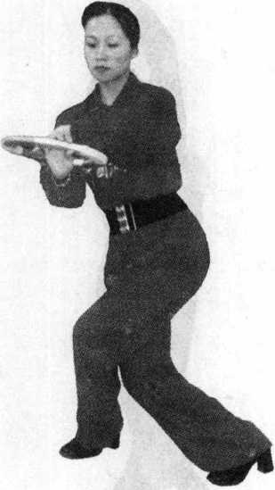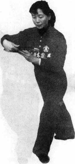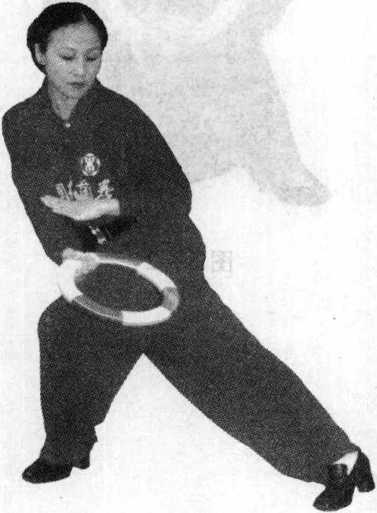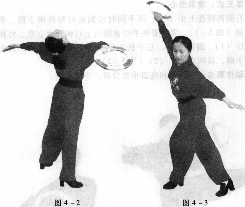 左脚后退(4),右手握 圈,经左向前绞圈,掌心翻 朝上,左手同时经右向后绞 圈,掌心亦翻朝上,右上左 下(图3 - l)o右脚后退