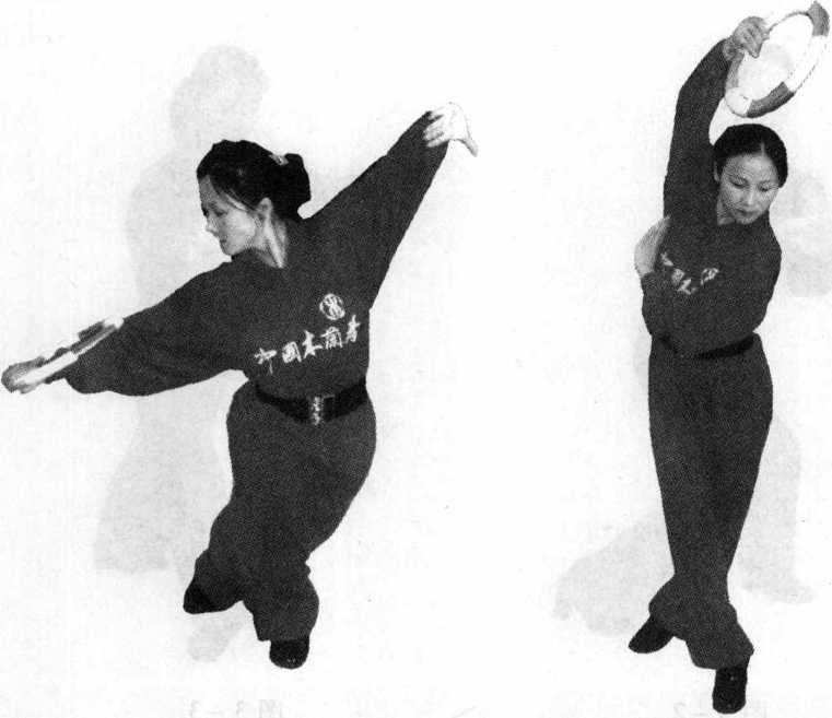 盖步(2),右手经右向左绞圈一周, 掌心翻朝下,左手同时经左向右绞圈 一周,左上右下,圈架于右手前小臂 上(图3 -4)。两腿屈膝,踏步蹲, 上体向右前倾,右手向右下方斜扫 (8)。左手左上举,掌心朝左斜上方 (3),目视右手方向(图3-5)。