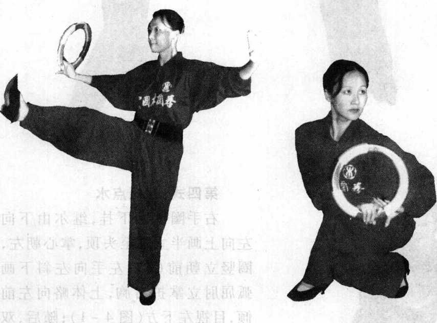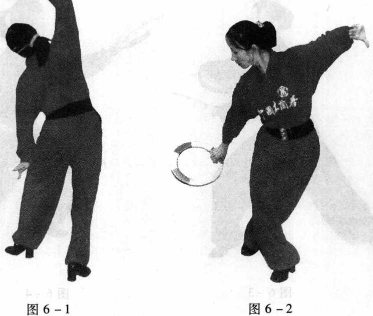 (2) ,右脚后插(2)(图4-3),右手 持圈向体左侧下刺(2),掌心向上, 左手护右手前臂,掌心朝下,目视圈 面(图4 -4) o