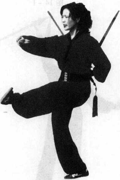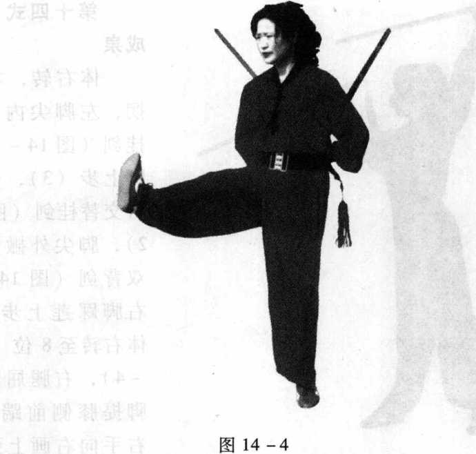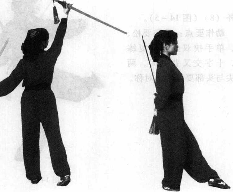 图 14 一5图 14 一5动作要点:手腕要松、 活,单手挟双剑需反复练 习,十字交叉背剑时,两 剑尖与头部要等距,对称。