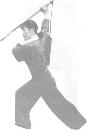 右脚落步(3位)(图13-1 ),左脚插步呈右弓步(3位),右 手于身体右侧逆时针划弧提剑(3位),剑柄斜朝上(3位),剑尖 斜向下(7位),身体略前倾,左手屈肘剑指护于右腋旁(5位),目 视前方(7位)身(图13-2 );左脚上步(7位),右手剑柄顺时针
