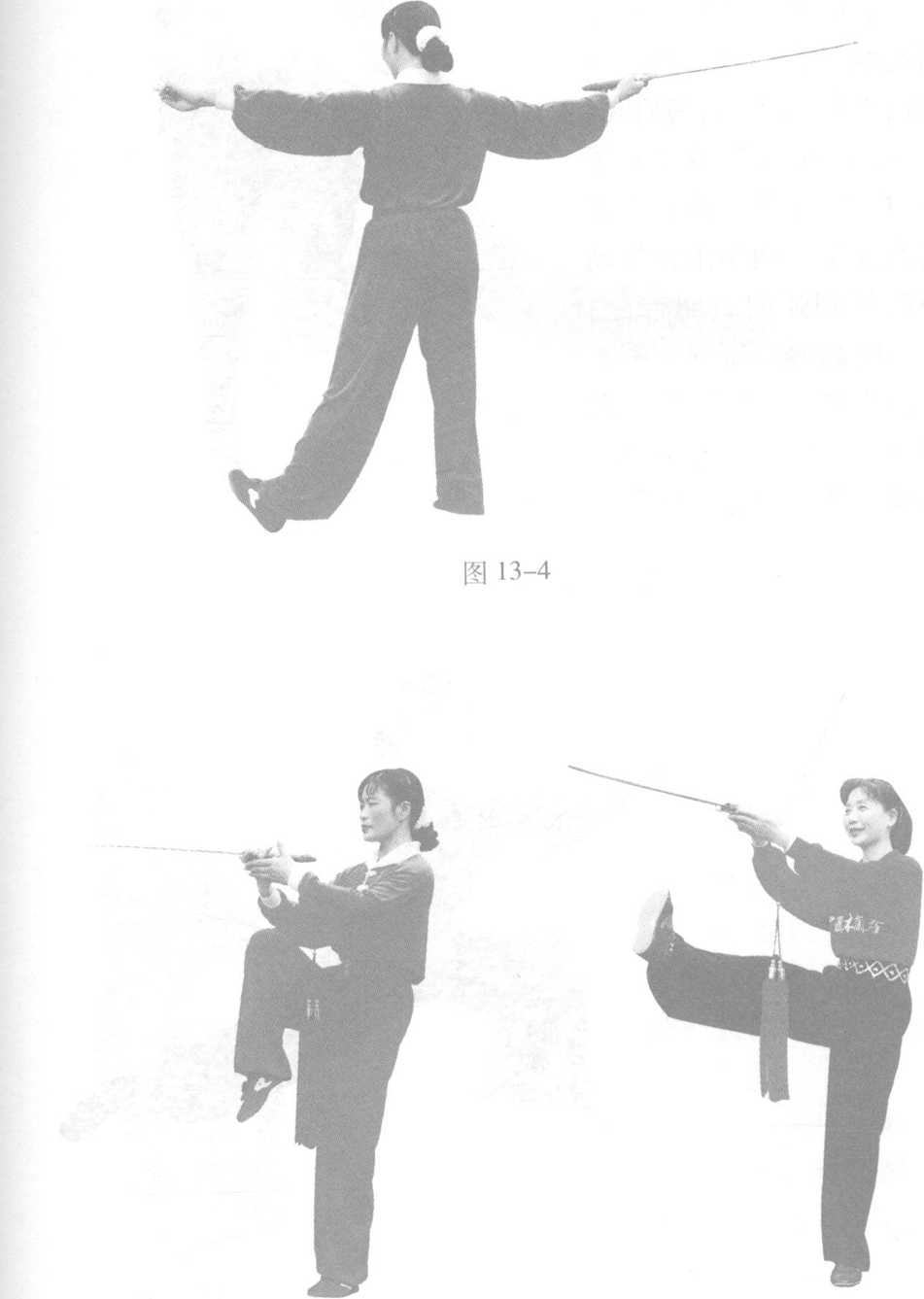 划立圆甩穗(图13-3),左手外 旋打开侧平举,掌心翻朝上(图 13-4);继而随右脚提膝(7 位),左脚独立,两手屈肘在胸前 合抱捧剑,两掌心均向上(图 13-5),右脚前蹬,高于腰,两手 捧剑前平刺,高于脖,目视前方 (图 13-6 )o