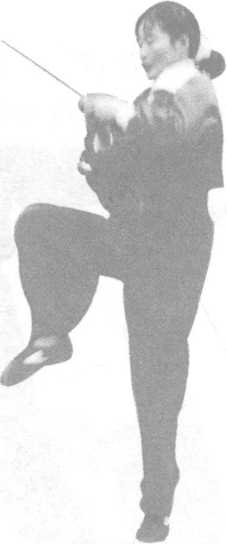 2 图 13-1图 13-1.蹬脚前刺剑,要求平剑, 勾脚尖,脚跟前蹬,高于腰。