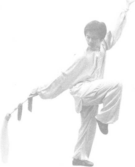 1 .提右膝、右手身体右侧划立圆向后斜下劈尘,与左手向前 直臂斜上举动作同步到位,且注意左手掌心向右。