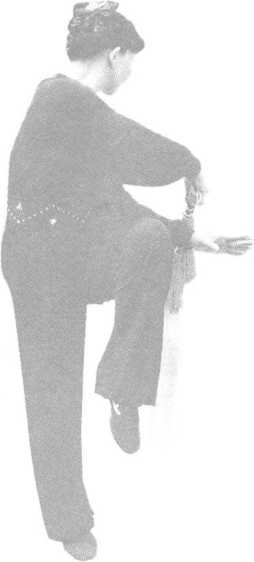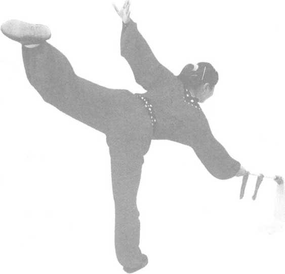3 .右脚独立向右碾转要稳,左脚直腿后抬高于腰,两手左高 右低成一斜直线。