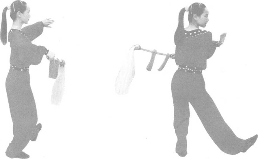 步(2位),脚跟先着地,两手左高右低胸前交叉相叠(图7-3、图 7-4 );左脚后抬,右脚独立碾步右旋(4位),两手随身体右转前 倾侧平打开,左高(8位)右低(4位)成一斜直线,目视右手尘(4 位)(图 7-5 )。
