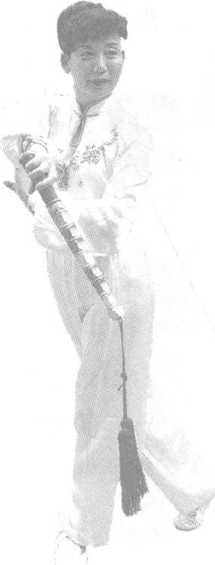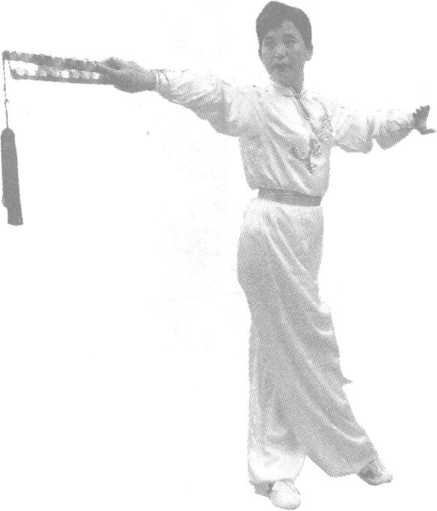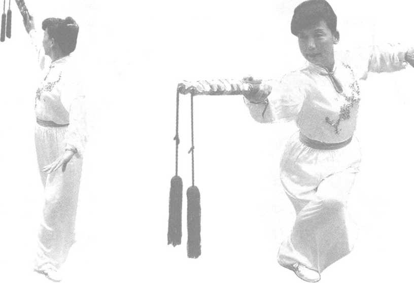 左脚外撇,两腿前后交叉半 蹲,右手随腰左拧逆时针划弧至 左胯前,左手屈肘掌心朝下交棍, 右手屈肘扣腕掌心向上接棍(图 2-1 ),身体抬起腰右转,右手身体 右侧顺时针划立圆随身体再次半 蹲向前撩棍,高与肩平,左手同时 逆时针划弧至左胸前屈肘横掌后 抽顶肘,掌心朝外,两手前后呈对 拔状(图2-2、图2-3);起身,右 脚盖步(5位),身体左转,右手内 旋手背朝前随身体转向左平移(6 位)(图2-4),继而在胸前顺时 针划一斜立圆(图2-5、图2-6、图