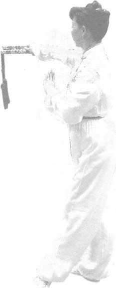 3 .右手胸前顺时针 划斜立圆落至左腰间,与 左手左后斜上托穿掌及 左脚屈膝后抬动作同时