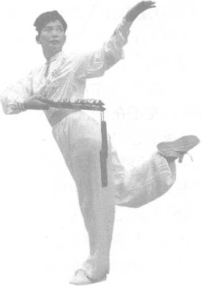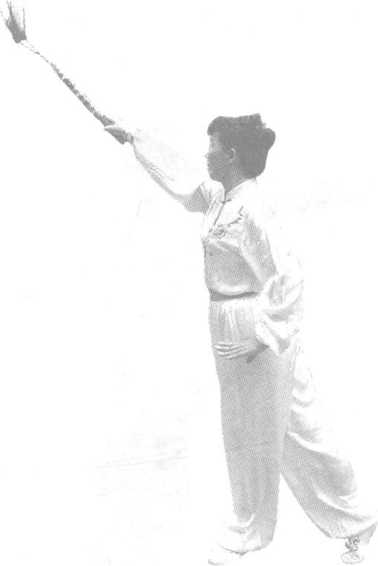 2-7 ),随腰左拧落至左腰间,掌心朝下,棍头向后(3位偏4位), 左手同时逆时针划弧向左后屈肘斜上托穿掌(2位),右脚屈膝后 抬(3位),目视左手掌(图2-8)。