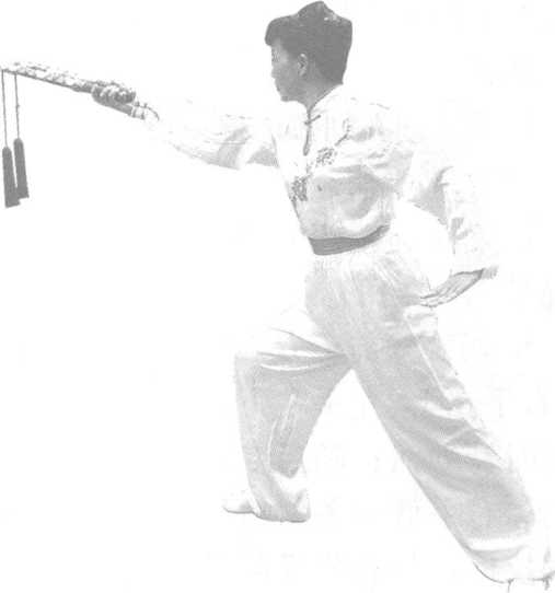 2 .右手随身体再次半 蹲撩棍时,左手则横掌后抽 顶肘,两手前后呈对拔状。