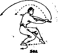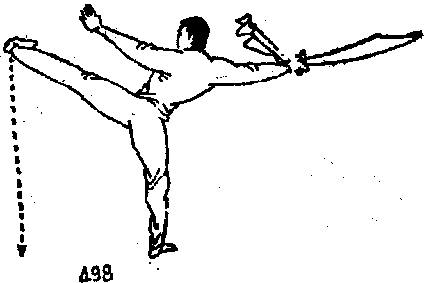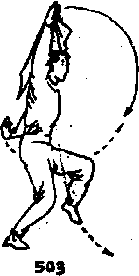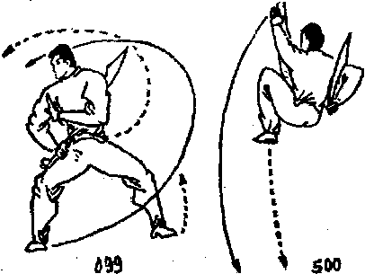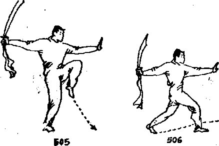 右手持刀不变左掌仍侧举从左脚向左侧落步开始向左斜前方走弧行步三步目视左掌(图506、507)。上动不停右手持刀不变左脚蹬地向前上方跳起右脚在空中碰击左脚目视左掌(图508)。