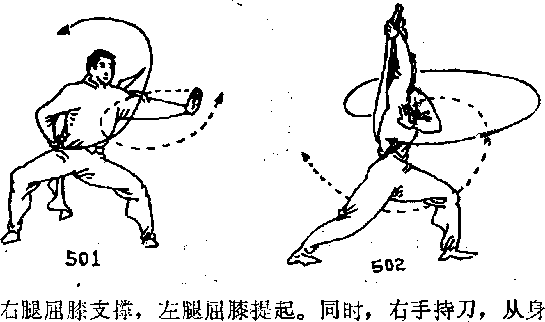 身体左转顺势左膝提起。同时右手持刀使刀尖上挑刀尖朝上左掌经腹前向左绕动侧前掌指朝上,目视左掌(图505)。