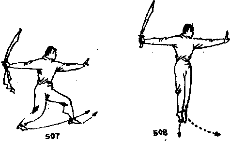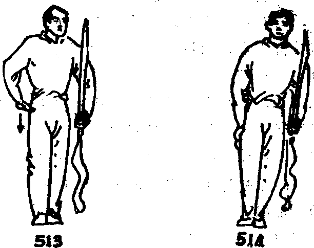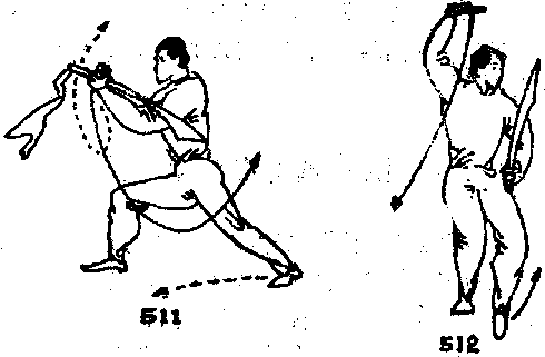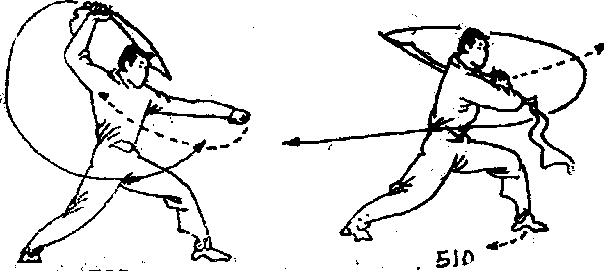 于右腋处,掌心朝下右手持刀使刀,尖朝下刀背朝里向体前左肩侧和身后缠绕当刀身绕行至左肩外侧时左掌从右腋处向前、向左侧平绕掌指朝前目视左手(图509)
