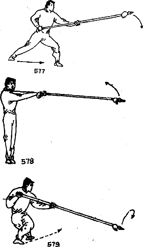 右脚向左脚并步同时右手向左胸前推把扣腕。左手滑握至右手前使枪尖下点目视枪类图578)。