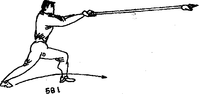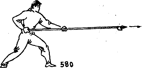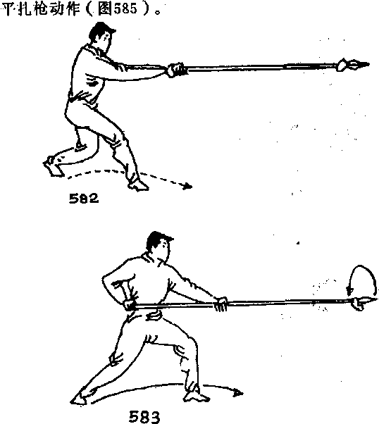 左脚向左前方上步成半马步。同时右手握枪把翻腕下压至腰右恻?左臂内旋左手翻腕里合使枪尖向上向前弧行绕行拿枪目视枪尖(图580)。右腿蹬直,身体左转成左弓步,、同时向前做中平扎枪动作。目视枪尖(图581)。