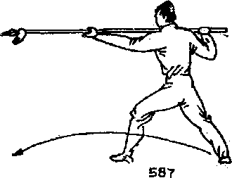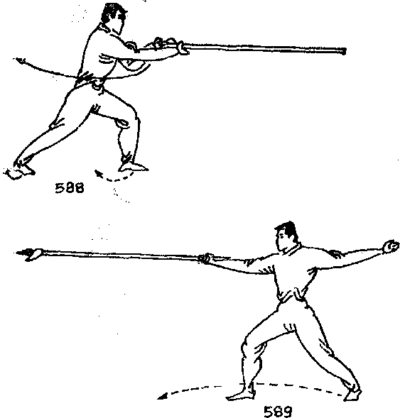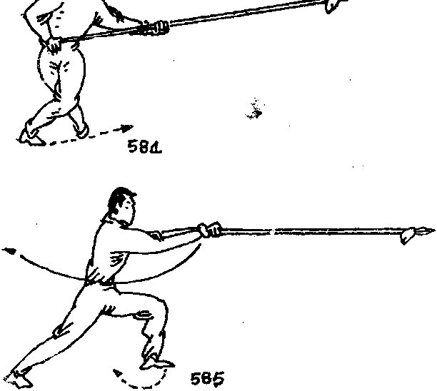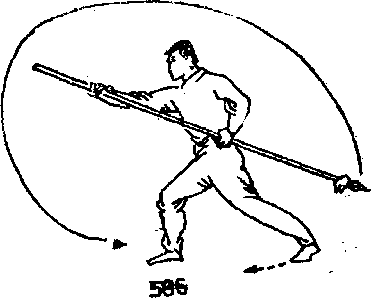 臂于胸前交叉使枪尖向上、向前向下划立圆枪尖朝下。左脚向前上步身体右转两腿稍屈膝脚尖朝前。同时左、右手继续绕动继而向枪身前后滑握使枪尖继续经右腿外侧向后、向上、向前划立圆枪尖高于肩平。目视枪尖(图587)。