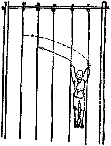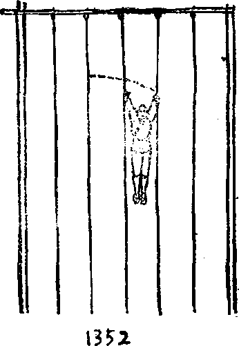 练翻腾缓慢动作至能随意停顿为止然后续练脱手跃两手各握一皮条用劲向下一抽使全身上升同时松开两手各向上滑起一握至顶为止下降亦同。脱手跃之后练横窜。练法略加旁行但不必按皮绳顺序移动可将身向侧一荡双手一按撤开全身向西跃过数尺超过数条而抢接从一、二条可飞跃而过抢接五、六条余可类推此功初成(图1353)。逐渐将皮绳换为手指般粗线绳依法练习最后练至将线条减至筷子细时也能随心所欲抓着任意穿行,此功大成。数年后手抓握细线条能上升自如此功已达登峰造极。