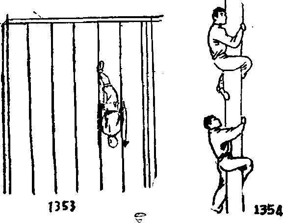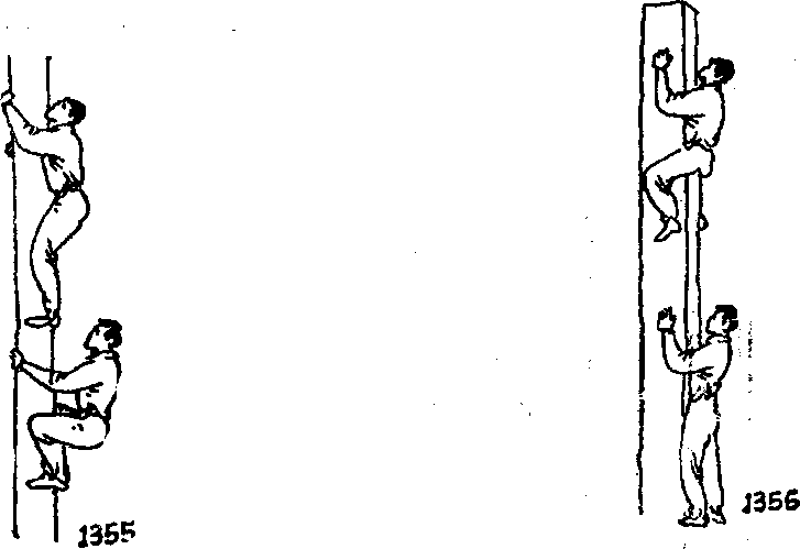 要领,站在高杆底部,将特制绳套套在双脚上然后两手紧抱高杆同时双腿跳起,两脚尖外张利用两脚前掌夹住高杆。而后两臂上移引体向上、两脚夹紧、两腿顺势向上蹬仲高攀。爬至高杆顶端时以相反动作下降其方法债单省力而且高攀速度较快(图1355)然后练习爬方角柱子或
