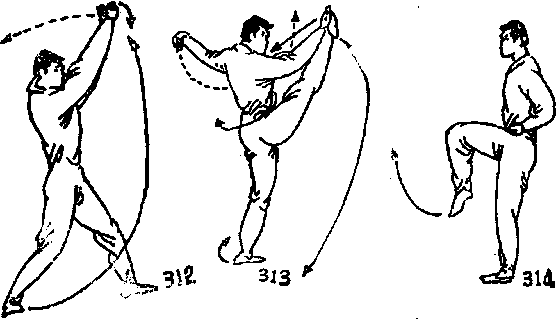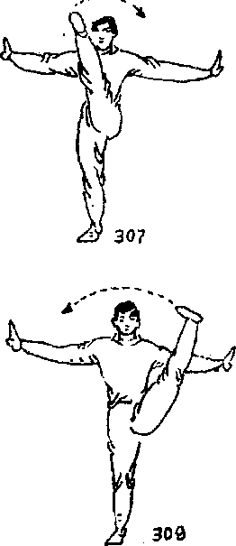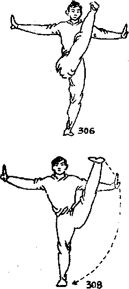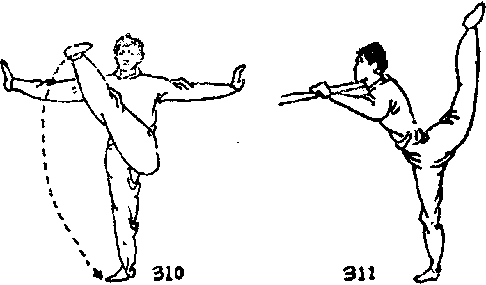 双手扶肋木或一定高度的物体并步站立。右腿支撑左腿绷足挺膝向后上踢起当大腿后踢过腰高度后也可松膝用脚掌去碰头部(图311)。练习时左右交替进行