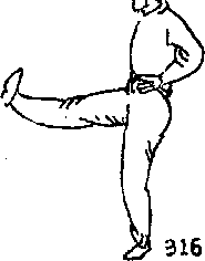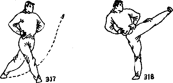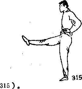 姿式与弹腿同。惟脚尖勾起力点达于脚跟练习时左右交替进行要求同弹腿(图316)。