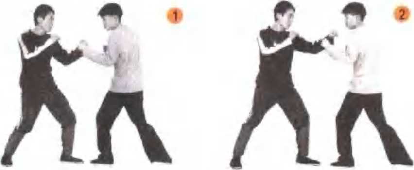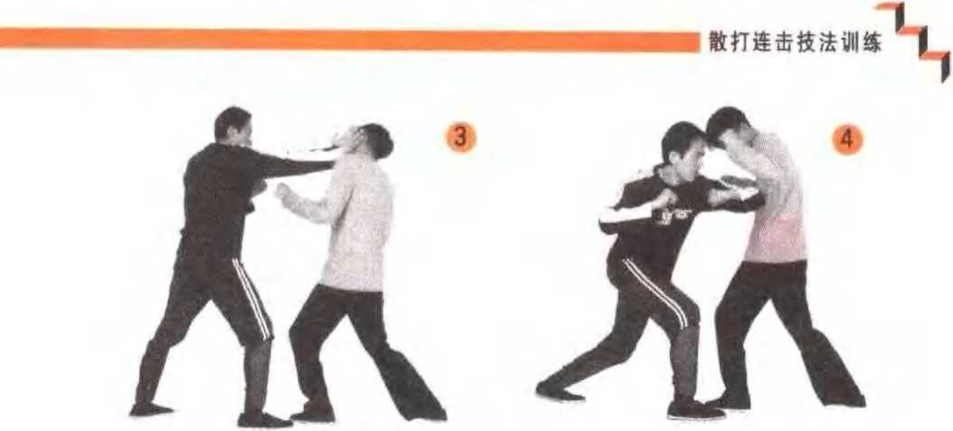 这实际上是个晃上打下的连击方法,拳法可作佯 攻引起乙方的防守,然后趁机俯身出肘攻击,待乙方 准备下防时再出拳攻击其面部G?动作甲方与乙方对峙时、甲方上步发出左手拳虚晃乙 方面门,乙方不知虚实闪身躲避,甲方迅速移步发出 右手掌劈击乙方颈部或面侧,在乙方被击闪晃身体 时甲方紧接转身发出左手肘顶撞乙方胸腹部(图I、 2、 3、 4)。80,说明上晃动作应逼真以引起乙方的变化,接着发招上 下连击。81