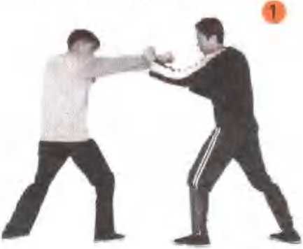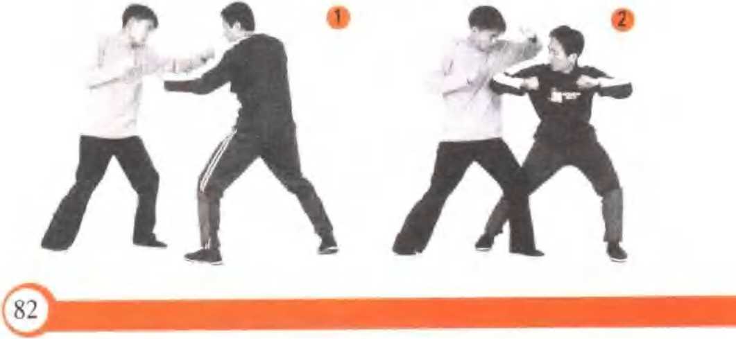 大腿根部或腹部,迫使乙 ' 方收式,甲方紧接落脚移 步闪至乙方身后发肘后顶击 其背肋部(图1、2、3)。