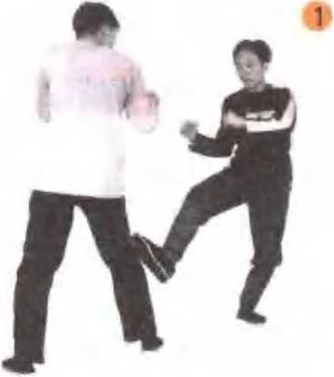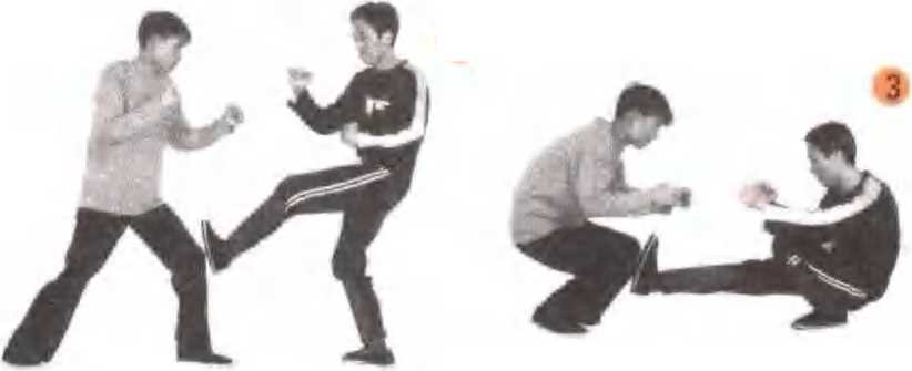 乙方向甲方靠近,甲方 迅速发出右脚拦踏乙方腿膝 乙方稍停,甲方紧接提膝换 步,转身发出右脚侧踹乙方 上盘头部(图1、2、3)。