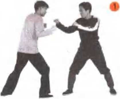 停,稍落右腿向前变式前踹乙方胸部(图I、2、3)。