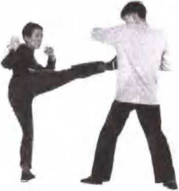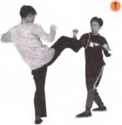 摆踢要跃过乙方手臂突击,顺势下落腿脚趁机 侧踹。