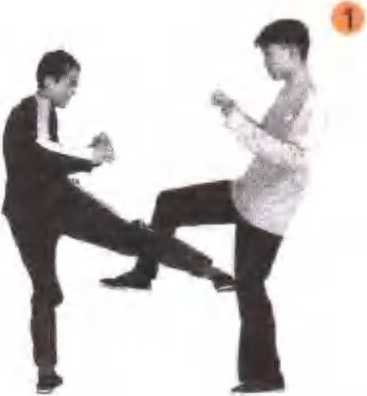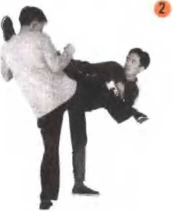 乙方起腿淮备攻击,甲 方上步抢先提膝发左腿摆踢 乙方头部' 乙方同时发出右 腿,甲方趁机以左手搂抱乙 方右腿,紧接下落的左腿向 前下猛侧踹乙方支撑腿膝