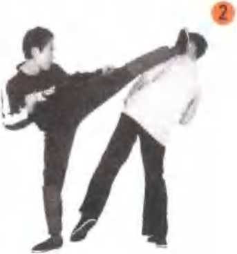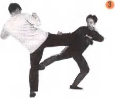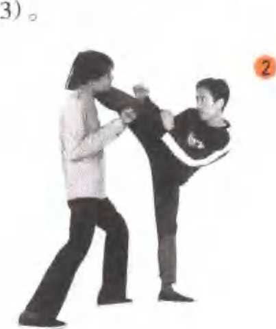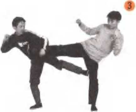 甲方向乙方靠近时,乙 方发腿扫踢甲方头部,甲方 迅速以两手架挡乙方腿脚, 未等乙方反应,猛发右边腿 扫踢乙方头颈部,随右腿击 出后顺势下落侧踹乙方支撑 腿膝(图1、2、3)。