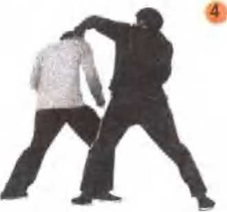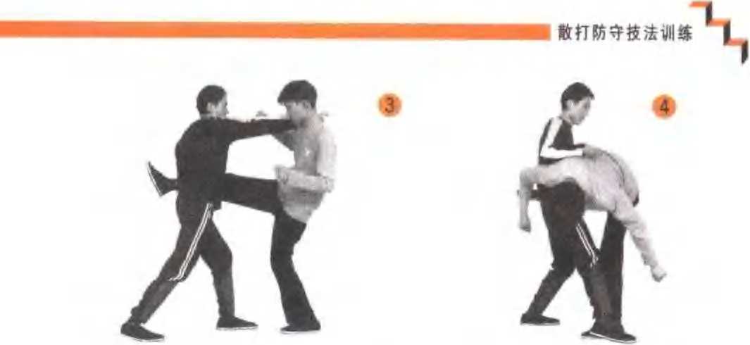 同时抄抱乙方右腿脚,乙方用力挣脱欲站稳,甲方迅 速转身发出右手直拳击打乙方面部,紧接屈收右手发 出左摆拳击打乙方头部(图1、2、3、4"