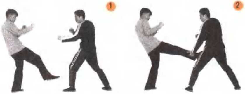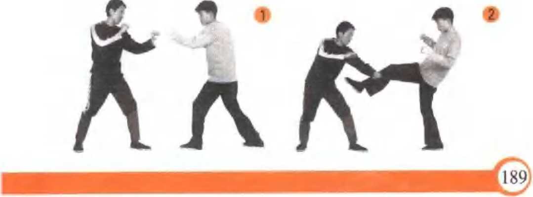 乙方抢先发出左腿弹踢甲方腹部时,甲方稍滑步 伸出左臂下挡乙方右腿脚,在乙方刚收式时,甲方迅