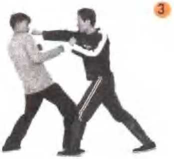 速发出右直拳直击乙方胸部,紧接稍转身发出左摆拳 击打乙方头部右侧(图1、2、3、4)。