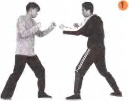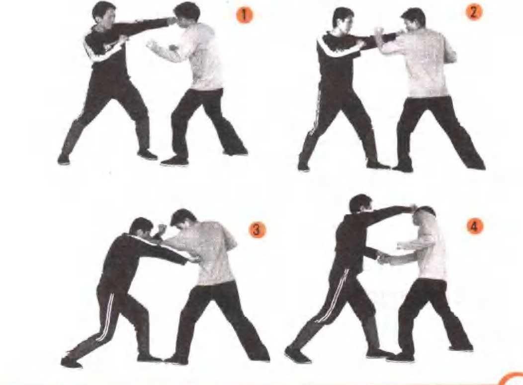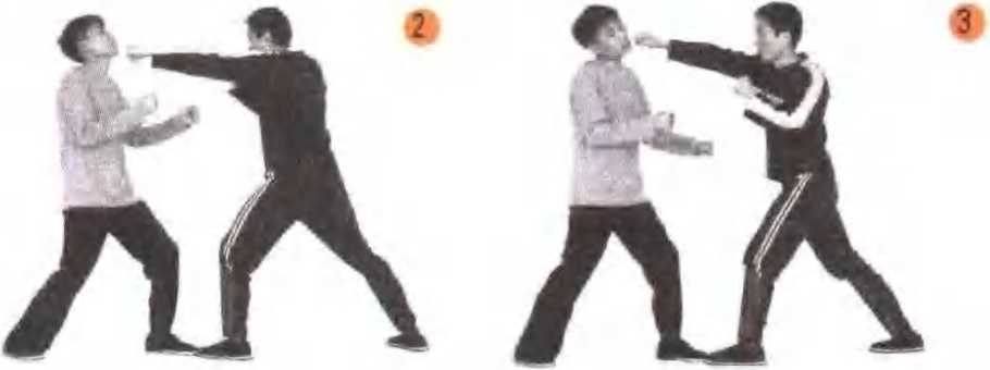 甲方与乙方对峙时, 甲方抢先发出左直拳佯攻 乙方面部,乙方被迫后仰 头部闪避,中方紧接收左 拳,上步发出右直拳攻击乙 方面部(图1、2、3) 口