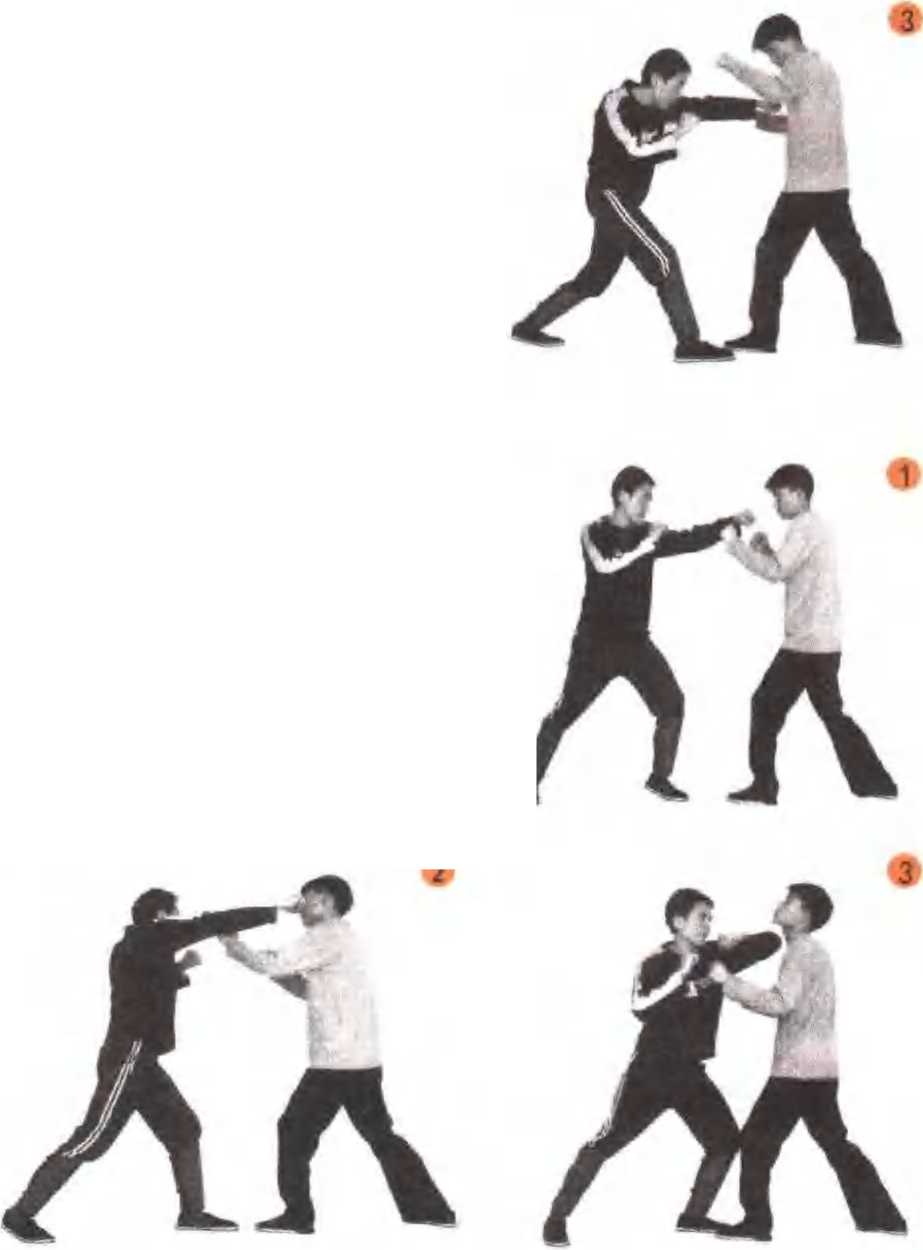 打乙方腰腹部,乙方欲以右臂压挡,甲方顺势收左拳紧 接上步转身屈右臂发肘顶击乙方后背或头颈部(图I、