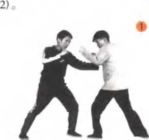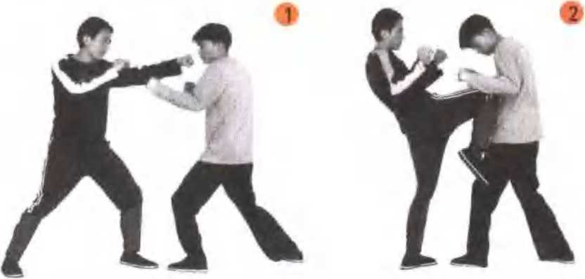 甲方与乙方对峙时,甲方发出左直拳击打乙方面 门,乙方被迫防守欲侧闪,甲方紧接左腿支撑身体, 右膝前冲顶撞乙方腰肋部(图1、2)。
